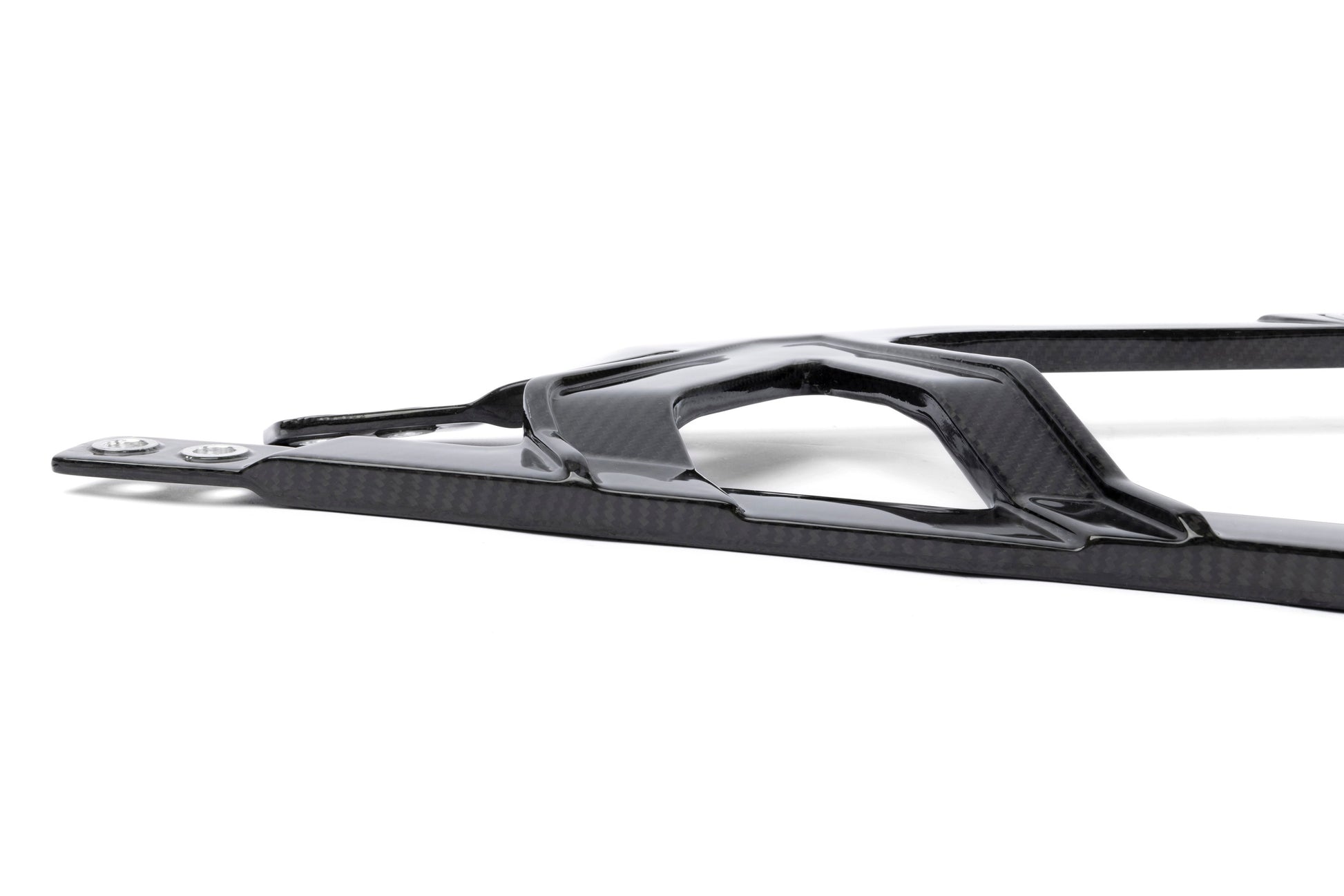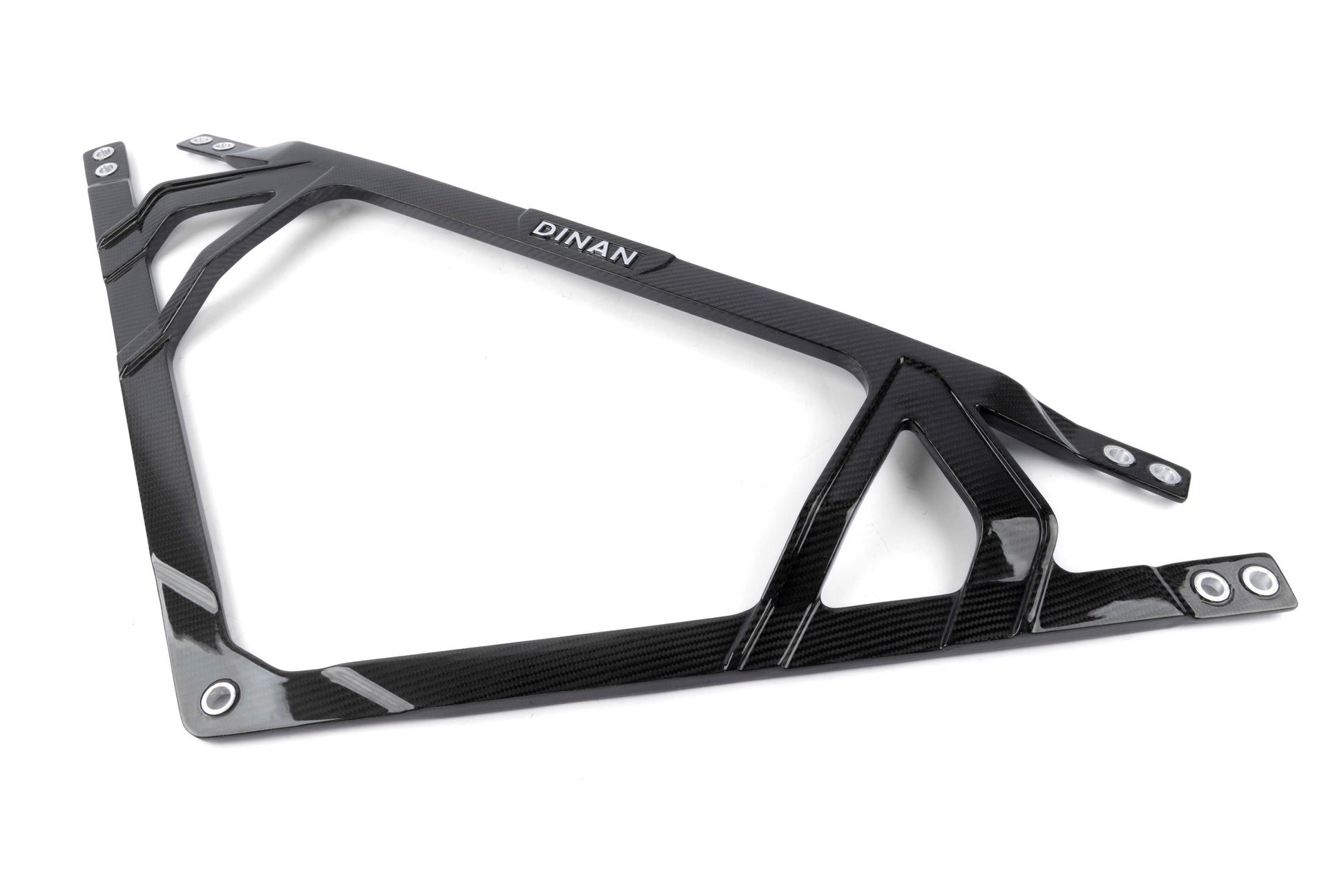 The Dinan G8x Strut Tower Brace provide additional rigidity and sharper handling to the chassis by reducing flex under hard cornering conditions. With more control, spirited driving becomes easier and infinitely more enjoyable. The lightweight brace is designed with maximum function in mind and includes linking structural elements that completely change the OEM 2-piece strut bar set into one blended system that offers additional strengthening against flex. Not one to take a back seat to functionality, aesthetics are also elevated beyond simple steel bars into striking carbon fiber (matte or gloss) with accents that tie in effortlessly into the highly geometric and angular factory engine bay for an OEM+ feel. The imposing carbon fiber brace can be installed in a matter of minutes and used in conjunction with either the stock or Dinan intake systems. While the brace was designed to specifically tie into the latter for a harmoniously balanced and unified appearance the brace can also stand on its own and elicit nearly as equally an impressive visual.