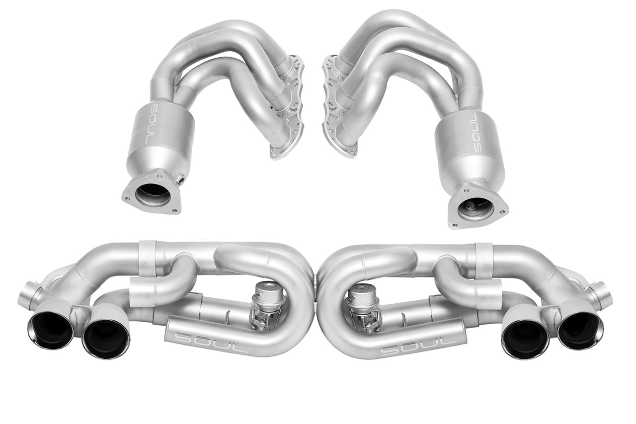 The Soul Performance 991.1 Carrera valved exhaust system was designed to deliver both performance but also a certain level of professionalism. With the valves open, the exhaust gases exit through an unrestricted path offering you, the enthusiast, a wonderful flat six symphony. Need to keep it a bit more mild mannered on your way to a client dinner or pulling in the driveway late at night? Not a problem whatsoever. Keep the valves closed and enjoy the a refined low tone as the factory side mufflers do their job quite well. Own a PDK? Worried about drone? Don't. The Soul Performance Exhaust for the 991.1 PDK will not leave you disappointed or frustrated. Street Headers are built around free flowing HJS HD 200-cell catalytic converters and long tube runners for maximum gains in power, throttle response, and flat-six engine tone.