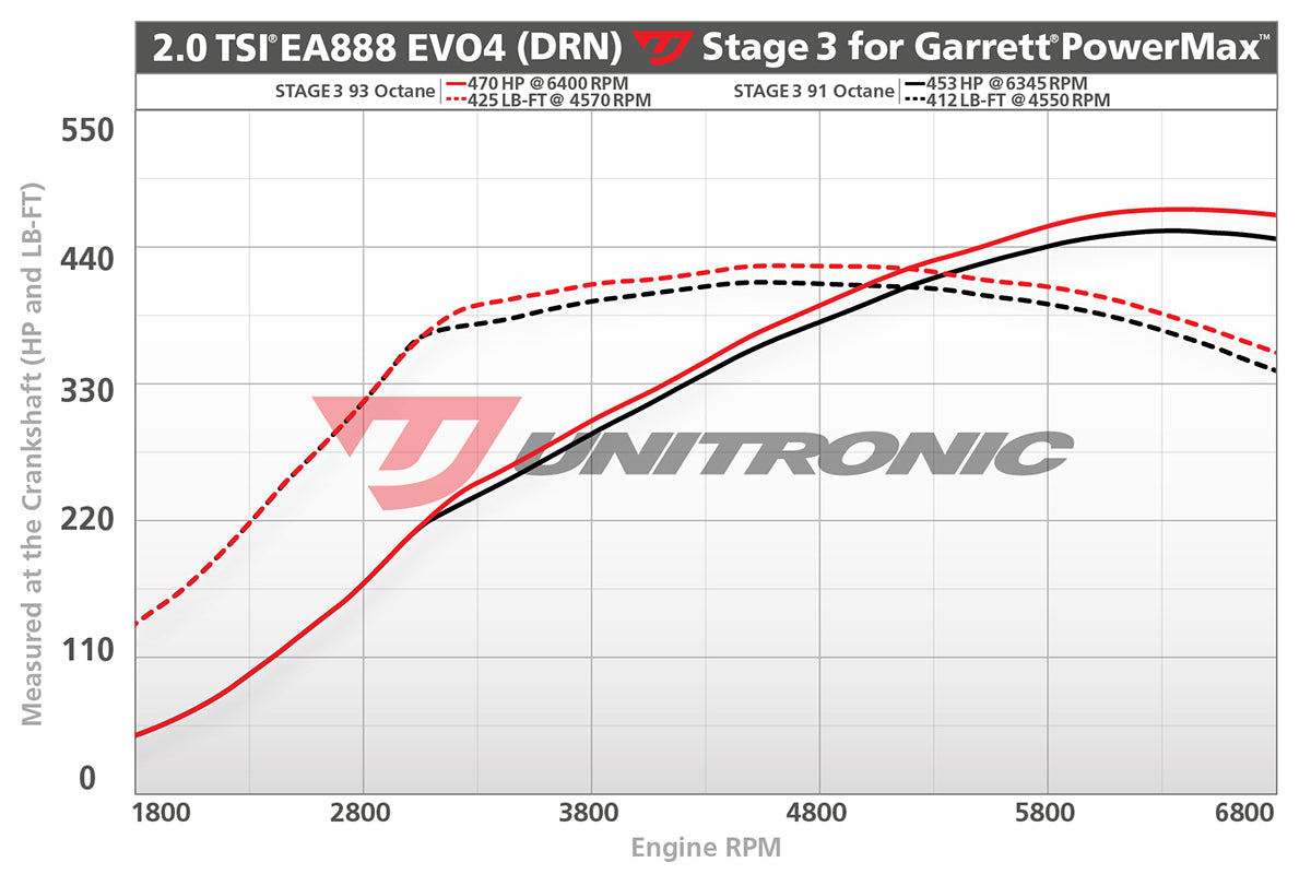 Unlock the true potential of your MK8 GTI with the Garrett PowerMax Turbocharger. Engineered to deliver remarkable performance gains, this turbocharger, when paired with Unitronic Stage 3 Software, can push your GTI to an exhilarating 470HP and 425 LB-FT of torque on 93 octane fuel, and even more when running on E85. Featuring cutting-edge GTX Gen II compressor technology and a robust Mar-M alloy turbine wheel, this turbocharger provides a 32% increase in compressor flow compared to the stock unit, ensuring greater efficiency and power.
